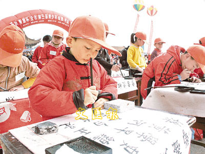 15日,河南省開封市近千名青少年匯聚在龍亭公園前的午朝門廣場,參加青少年繪畫、書法作品現場比賽。 新華社