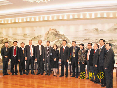 ■李源潮與香港嘉賓合影留念。左起:盧溫勝、呂敏、邱天生、張華峰、鄒哲開、黎桂康、梁愛詩、李源潮、張國良、周鈱、鄭耀棠、周志榮、區永熙、陳勁。