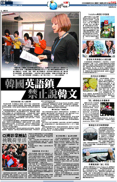 韓國有個「英語鎮」位於韓國北部的坡州(Paju),面積約二十七萬平方米,相等於二十八個香港大球場。乍看這鎮跟其他韓國城鎮分別不大––由大會堂的圓屋頂伸延出去,街道上商舖林立,有酒吧、書局、食肆、銀行和戲院等。電車穿梭主要的林蔭大道,鎮內居民也是黑頭髮、黃皮膚的韓國人,但他們卻只准用英語溝通。城鎮內使用韓語乃屬「非法」;「犯法」雖不致受懲罰,然而鎮內人人皆「奉公守法」–– 一律以英語對話。