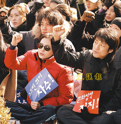 ■池珍熙(右)曾為同業爭取權益而示威,亞洲電影業界也得同心挑戰荷里活。 路透社