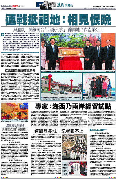 中國國民黨榮譽主席連戰一行結束北京的行程,於17日下午6時前從北京飛抵福州長樂國際機場,展開為期5天的「福建祖地行」。中共福建省委書記盧展工昨晚在此間會見連戰一行時表示,閩台一水之隔,具有特殊的「五緣六求」(編者按,「五緣」是指地緣、血緣、文緣、商緣、法緣,「六求」是指求密切的經貿關係、求兩岸直接「三通」、求農業全面合作、求文化深入交流、求旅遊雙向對接、求載體平台建設。)後,連戰表示,閩台兩地完全可以優勢互補,特別可在產業分工合作方面大有作為。