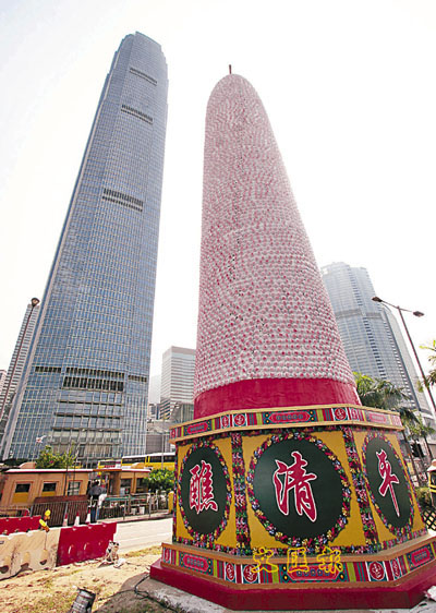 ■包山不一定在長洲北帝廟前出現,昨與中環的國金大廈相映成趣。本報記者羅蘭蓉 攝