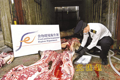 【本報訊】食環署根據情報,昨晨聯同警方採取行動,在元朗白沙村破獲一個利用貨櫃流動形式活動的非法屠場,檢獲7隻被宰死豬,拘捕一名男子。貨櫃內,被宰豬隻與豬內臟滿地,傳出陣陣惡臭,惹來不少蒼蠅,衛生環境極惡劣。食環署相信,該批來歷不明的豬肉是趁今日天后誕供應給肉檔小販出售,其後取出部分豬肉樣本化驗,剩餘的豬肉及豬內臟則載入黑色大膠袋運走銷毀。圖為食環署人員檢視檢獲的豬殼。