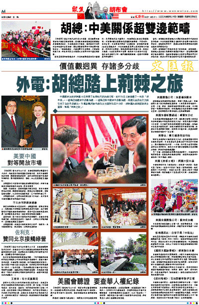 中國國家主席胡錦濤18日展開了為期四天的訪美行程,並於20日上演推遲了一年的「胡布會」。一個是發達國家中的最強國,一個是發展中國家中的最強國,兩國元首的此次交鋒引來了全世界的觀注。外電普遍評論中美在多方面存在巨大分歧,胡錦濤訪美將面對很多難題,堪稱「荊棘之旅」。