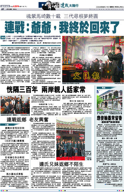 上午9點15分,連戰攜夫人、子女,在中台辦主任陳雲林、副主任鄭立中,以及福建省、漳州市領導陪同下抵達馬崎村連氏宗祠。「鞭炮放了一路,彩旗插了一路,我和我的太太、孩子們都非常感動。」連戰如是感言。