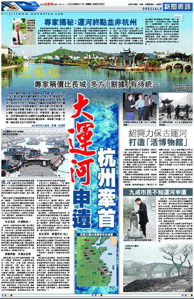 京杭大運河北起北京,南到杭州,流經6省17市,全長1,794公里,比蘇伊士運河還長10倍,是世界上開鑿最早,也是最長的一條人工河。它連接了錢塘江、長江、淮河、黃河、海河五大水系,一舉貫通了中國南北的經濟和文化,專家將其定位在「可與長城媲美」。對於這樣一件無價之寶,近年來雖各方呼籲「申遺」之聲不絕於耳,但實際上並無多少進展。究其原因在於跨市太多,所管者眾,難以統一。為此,3位年齡加起來有230歲的元老級專家特赴杭州考察,希望能解此難。而杭州方面終於傳出消息,準備牽「申遺」之頭,做成這件功在千秋的好事。