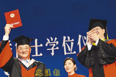 ■連戰獲授名譽法學博士學位後,高舉學位證書向廈大師生致謝。 本報記者米南 攝
