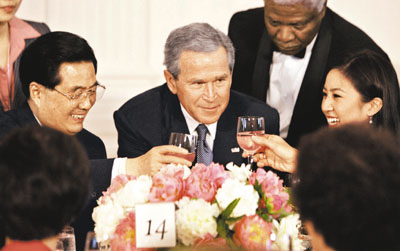 ■布什舉行午宴,與胡錦濤一邊進餐一邊會談,著名奧運美國華裔滑冰選手關穎珊(右)亦是座上客。 路透社