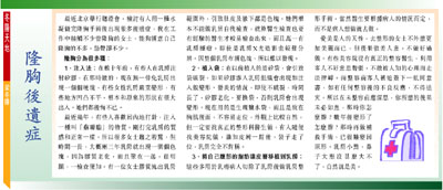 2、植入袋:在以前植入的是矽袋,會引致袋破裂,如果矽膠滲入乳房組織會出現如注入般變形、發炎的情況,即使不破裂,時間長了,矽膠老化,要換袋,否則乳房會出現變形。現在用的是生理鹽水袋,而且是放在胸肌後面,不容易走位,外觀上比較自然,但一定要找真正的整形科醫生做,有人隨便找美容院做,誰知皮層一鬆後,袋子走了位,乳房完全不對稱。