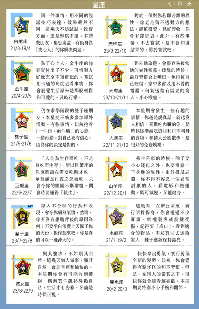仍在求學階段的雙子座朋友,本星期不妨多參加課外活動。有些事情,切勿抱著「一件污,兩件穢」的心態,一錯再錯。對自己要有信心,因為你的決定是對的。