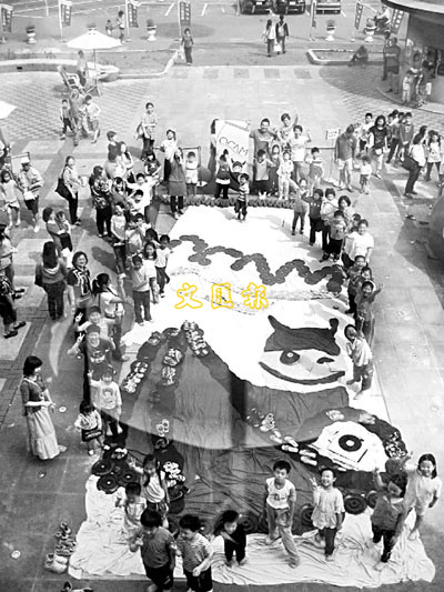 牛仔褲變身牛角帽,窗簾布成了維京船身,22日下午,基隆陽明海洋文化藝術館舉辨兒童創意遊戲,小朋友利用垃圾桶蓋、舊紙箱拼出藝術品。 中央社