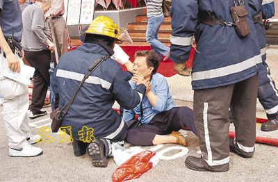 ■一名婦人倉皇逃生期間不慎仆倒受傷,由消防員扶起等待送院。