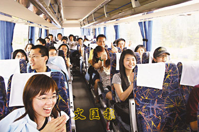 考察團學員一路奔波勞累,難免覺得無聊,除了躺在旅遊巴士座椅上睡覺,剩餘的時間便用來聊天。導遊小姐別出心裁,建議由組長帶頭表演節目,並推薦下一位表演者。學員紛紛踴躍參與,車廂氣氛頓時活躍許多。