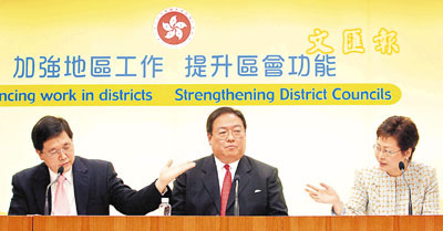 特區政府昨發表《區議會角色、職能及組成的檢討》諮詢文件。民政事務局常任秘書長林鄭月娥在記者會上表示,為令當年2個前市政局遺留共1681項小型工程得以展開,當局建議設立3億元基本工程撥款,以及增加用於推行社區活動的區議會撥款額至3億元。