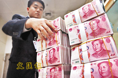 ■央行官員強調,上調貸款利率,主要目的為抑制過度投資,讓經濟平穩發展。圖為南京民生銀行職員在點算鈔票。 路透社
