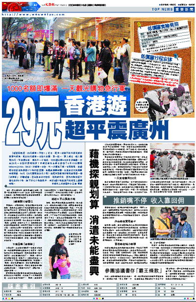 「超低震撼價,29元香港一天遊!」近日,廣州一家旅行社以祝賀新店開張作招徠,推出58元香港一日遊大巴團,買一送一,兩人報名,每人團費29元。消息傳出後,業內外一片嘩然,1000個名額4日內全部售罄。究竟29元一日遊的真相如何?本報記者特意報名參加了4月18日團號0604HK2X18A(巴士)的香港一日遊,作一次實地了解。結果發現,這個即日往返耗時長達17小時的低價團,其實就是購物團。若旅客志在來港購物或探親,54元(29元團費加25元小費)包廣州到香港的單程車費連一餐「家常飯」,的確超值;但若旅客志在遊玩,則沒甚好玩,因為扣除往返交通花去的5小時,餘下的12小時旅程中,有近9個小時被旅行社帶至三個購物點。 本報珠三角新聞中心記者 晴朗