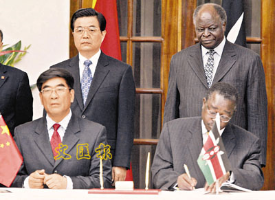 【本報訊】綜合外電消息、新華社以及中新社28日消息:中國國家主席胡錦濤28日在內羅畢同肯尼亞總統齊貝吉舉行會談。會談後,兩人還出席了雙方關於經貿、文化、教育等領域合作文件的簽字儀式。與此同時,中國海洋石油總公司(CNOOC)宣布與肯尼亞達成6項協議,在肯尼亞的115,343平方公里印度洋域開採石油,有關活動分三個階段進行。