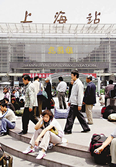 27日,「五.一」黃金周將至,遊客正在上海火車站外候車。美聯社