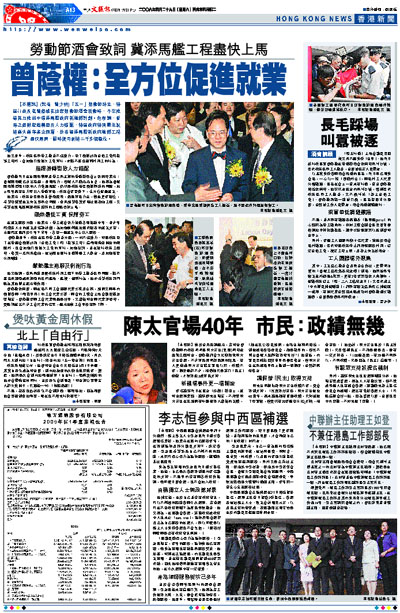 曾蔭權昨日在由經濟發展及勞工局主辦的勞動節酒會上致詞時表示:香港經濟雖已步出陰霾,重現活力,但港人不應沾沾自喜,他認為香港經濟轉型而引致的人力資源錯配,仍然是政府需要積極解決的問題,加上每年都有生力軍投入勞動市場,政府會多管齊下,全方位促進就業。