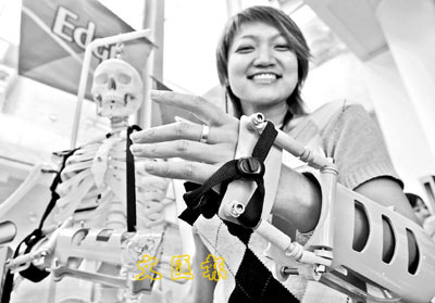 ■理大康復治療科學系博士劉沐青示範使用腕骨骨折治療器材,手腕關節仍可活動。本報記者李志樑 攝