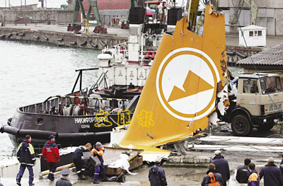 ■在索契港口,失事空巴尾部被打撈上岸。 法新社