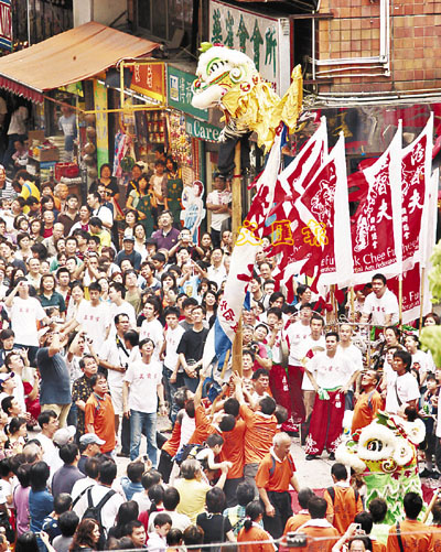 昨晨10時許,已有成千上萬市民聚首於筲箕灣電車總站一帶,準備迎接這個40年來最盛大的譚公誕飄色巡遊,在一條由60人舞動的大金龍、真人版包青天與展昭、觀音大士及唐僧四師徒的引領下,大隊沿宏華街、金華街及東大街一直走至譚公廟,沿途車水馬龍、旌旗蔽日,各參與巡遊的團體都舞動著別出心裁的醒獅及金龍,把氣氛推到高潮。