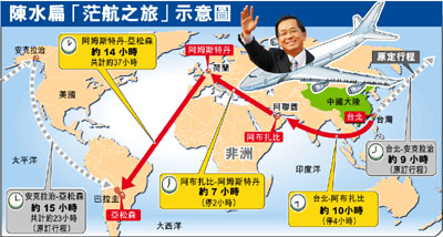 媒體還透露,陳水扁專機過境地點一變再變,從安克拉治到貝魯特,再到阿布扎比,台灣決策階層幾乎將幾個備案都用進去了。扁專機在4日上午8點半起飛,但過境地點仍未宣布,據了解,此時的目的地是黎巴嫩貝魯特。可是一個半小時後,收到黎巴嫩方面的拒絕,專機等於是在空中決定改降阿布扎比。