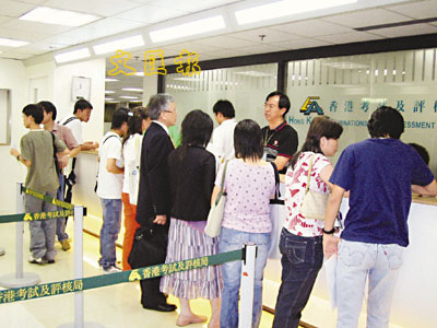 ■去年中學會考放榜時,揭出英文科部分考生的成績計算錯誤。圖為考生紛到考評局要求覆核成績。 圖片資料