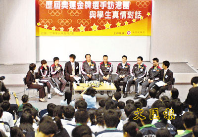 ■歷屆中國奧運金牌健兒代表:許海峰、樓雲、熊倪、吉新鵬、冼東妹、王濛、韓曉鵬與香港學生真情對話。中新社
