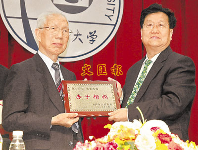 月前,海南省向田家炳先生(左)頒發「赤子楷模」榮譽稱號。原來香港田家炳基金會迄今在海南捐贈教育事業達九百多萬元人民幣。資料圖片