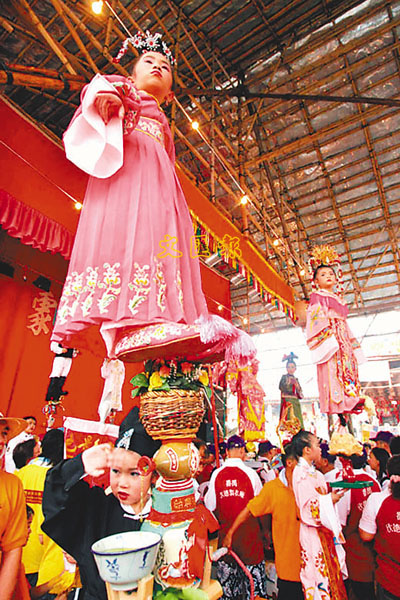 看熱鬧的苦頭吃得差不多了,遊客的優越感被太陽和時間壓下去,鼕鼕鐺鐺的鑼鼓聲這才從遠處慢慢響了過來。鑼鼓聲越來越響,一竿大旄扯著某某社團的旗號從人頭上分過來,遊客的人群像波浪一樣紛紛往街道兩旁破開。「飄色」巡遊的隊伍氣勢沉沉地來了。