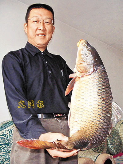 12日,甘肅蘭州的劉先生在黃河邊的青獅灘釣到一條長約80厘米、重約8公斤的黃河大鯉魚。圖為劉先生展示自己釣到的大鯉魚。 新華社
