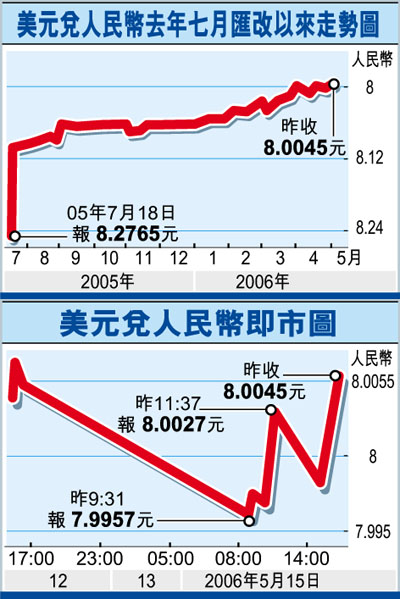中國人民幣匯率昨日衝破8元兌1美元的心理關口,這是自去年7月中國重新評估人民幣幣值以來的最高水平。有業內人士表示,這意味著北京政府似乎有意加快人民幣的升值速度。
