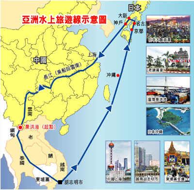 日本觀光振興機構理事新井佼一描繪了這項宏偉的計劃:遊客從雲南景洪港乘坐游船順瀾滄江—湄公河順流而下,沿途遊覽緬甸、老撾、泰國、柬埔寨,在湄公河入海口處越南胡志明市改坐海上郵輪前往日本。在日本沖繩、神戶、大阪、京都、名古屋等地觀光,接下來的行程,再次乘坐海上郵輪,前往中國上海,從這裡順長江逆流而上返回雲南。
