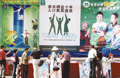 ■15日是中國十三屆「防治碘缺乏病日」。河南省鹽務管理局、河南省衛生廳在鄭州街頭聯合開展「防治碘缺乏病日」宣傳活動,以加強防治碘缺乏病的健康教育。圖為一些鄭州市民在宣傳台前諮詢。 新華社