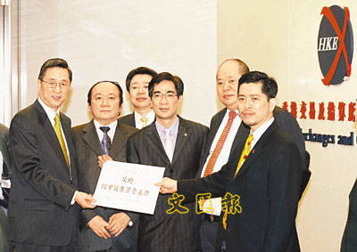 ■詹培忠(左二)向港交所遞信,由周文耀(左一)接收。