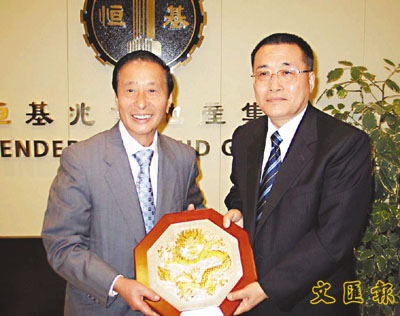 ■王金山(右)和李兆基互贈禮品。 胡旭 攝