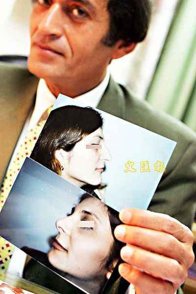 ■一位埃及醫生展示整形女病人鼻子整形前、整形後的照片,他強調整容者要了解整形醫生是否合專業資格,為慳錢而冒險並不值得。法新社