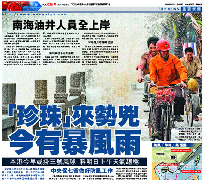 有紀錄以來於5月份進入南海的最強颱風「珍珠」逼近香港,加上珠江口將出現的天文大潮,令廣東省沿岸各地都全力防範。本港一號戒備信號繼續生效,颱風「珍珠」昨晚9時集結在香港之東南偏南約400公里,以時速約16公里向北移動,趨向廣東東部海岸。天文台說,按照現時預測途徑,「珍珠」會在今日後半部時間最接近本港,考慮在今早改發三號強風信號,「珍珠」雨帶亦會影響本港,今日全日都會有狂風暴雨,天氣情況要到明日下午才會轉趨穩定。