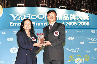 ■新鴻基地產公司傳訊總監劉美梅(左)接受雅虎香港頒發「七大感情品牌大獎」,新地是唯一地產商獲此殊榮。