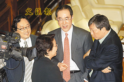 ■由於在答問大會無人問及添馬艦問題,唐英年唯有趁被陳婉嫻、鄺志堅及李卓人包圍時,代替特首宣布新政府總部將採舊建造方式處理,為建造業工人創造就業職位,結果贏得勞工界議員的支持。 李志樑攝