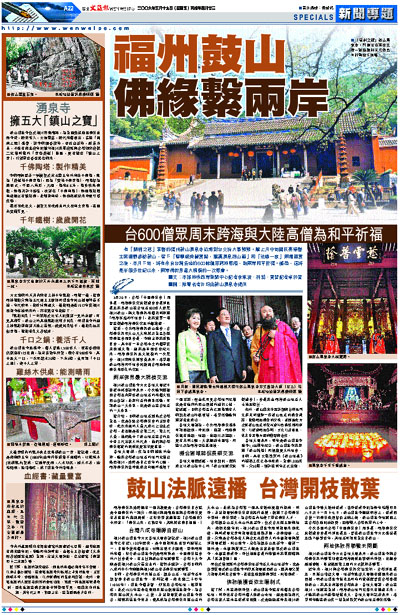 有「閩剎之冠」享譽的福州鼓山湧泉寺近期對台交流大事頻頻。繼上月中旬國民黨榮譽主席連戰參訪鼓山,留下「聖學經典藏寶閣,羅漢湧泉潤山靈」和「法緣一家」兩幅墨寶之後,本月下旬,將有來自台灣各地的600餘僧眾跨海聚榕,為兩岸和平祈福。據悉,這將是半個多世紀以來,兩岸佛教界最大規模的一次聚會。