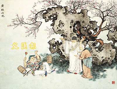老萊子搖搖擺擺地走到水桶前,摺起衫袖,咬緊牙關地舉起水桶。水桶看似太重,費了好大勁兒才抱得起,倒退幾步,一失手,灑了一地水花。老萊子大踏步在濕漉漉的地面上誇張地擺動雙臂來回走動,像小丑般滑稽地跌倒,躺在水中呀呀假哭。他父母竟看得喜孜孜,更拍手嘻笑呢,半晌,才喚小婢扶愛兒起身更衣。老萊子仍把腰扭幾扭,扮小孩子發脾氣,婢女忍著笑忙扶他入內室。