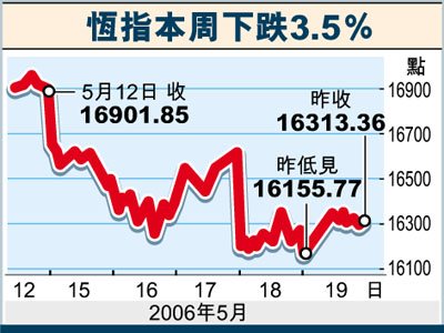 【本報訊】(記者 周紹基)港股昨日開市早段受美股下跌拖累,低開96點,但受中行(3988)招股反應理想刺激,恆指迅速收復失地,轉跌為升,中午港股一度升至16,361點高位,其後升幅逐步收窄,全日只升46點,收報16,313點,成交縮減至294億元。國指則微升9.8點,報7042點。全周恆指累計下跌588點,跌幅達3.5%;國企的跌幅更大,達4.5%,全周下跌335點。市場人士普遍認為,昨日港股尾市升幅收窄、成交縮減,反映港股弱勢持續,下周股市難以看好。