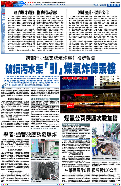 【本報訊】(記者 陳朗昇)由警方、消防處、機電工程署及政府化驗所組成的跨部門小組,完成有關牛頭角偉景樓上月中發生2死9傷奪命煤氣爆炸事件的初步調查。報告指出,估計事發時,煤氣經破損喉管洩漏,再由破損的地下主污水渠,傳送到偉景樓入口附近,再經已荒廢的污水渠支管內的泥土滲透出外。「漏氣」其後積聚於大堂地下空間,被位處大堂末端的一個水泵操作時引起的火花點燃,引致爆炸。