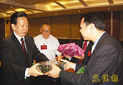 ■河北省政協主席趙金鐸(左),給香港河北海聯會赴冀理事致送紀念品。 本報記者袁坤 攝