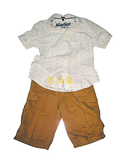 男士如果喜歡簡單的款式,這套配搭可試試,白色細波點的上衣,再配以軍綠色的短褲,簡單利落。上衣售價:$430,短褲售價:$460