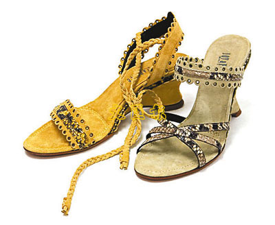 如果嫌一般船跟鞋太過重,可選這款粉黃或淡綠色麂皮小船跟涼鞋。一方面有船跟的特色,另一方面鞋身較輕,可讓步履較輕盈。整個船跟與鞋墊均包上麂皮;而鞋面搭帶起用蛇皮壓紋皮革,加上小巧撞釘與荷葉裁邊營造的出典雅味道,盡顯高貴。售價:$1495