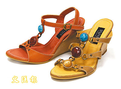 鮮黃色瑪瑙彩石船跟涼鞋 (圖)