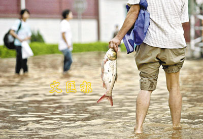 ■東莞市前兩日連續下暴雨,導致魚塘漫頂,道路嚴重水浸,市民更可在水浸的路面捉到塘魚。 路透社